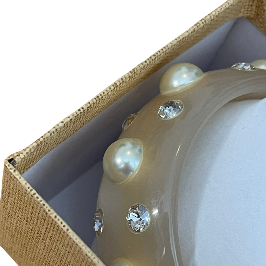 Cream-coloured bangle in mother-of-pearl look with cream Swarovski crystals and half artificial pearls.